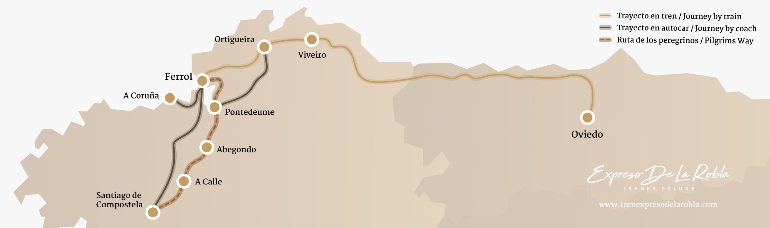 El Tren Expreso de La Robla ofrece tres recorridos. Recorrido La Robla: 3 días y 2 noches, a elegir entre entre Bilbao y León, o León a Bilbao. Ruta del Peregrino: 6 días y 5 noches realizando distintas etapas del Camino de Santiago.